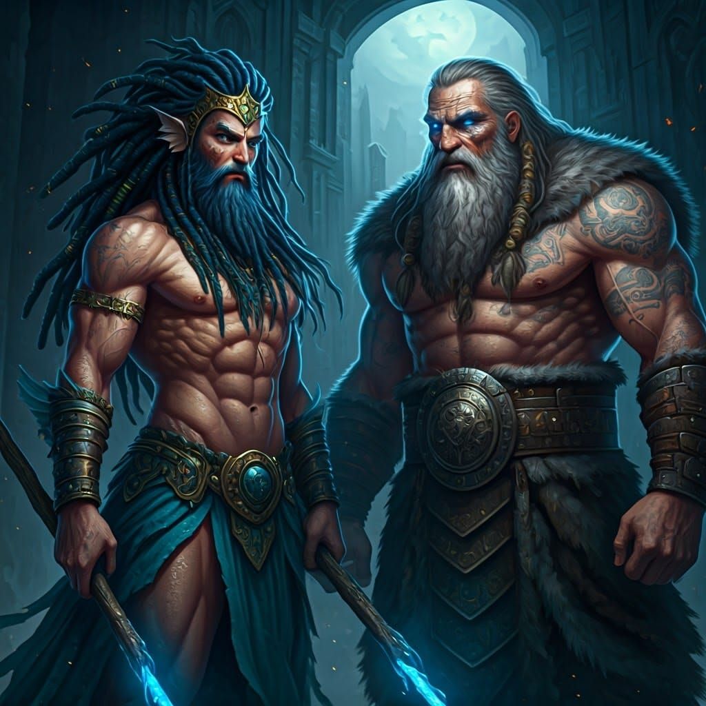 This image shows a dramatic scene of a powerful sea king facing off against a scarred Viking warrior in a dimly lit castle at night. The sea king has a distinctive blue-green dreadlocks and emerald headdress, while the Viking warrior has pale blue eyes and a muscular body with tattoos.