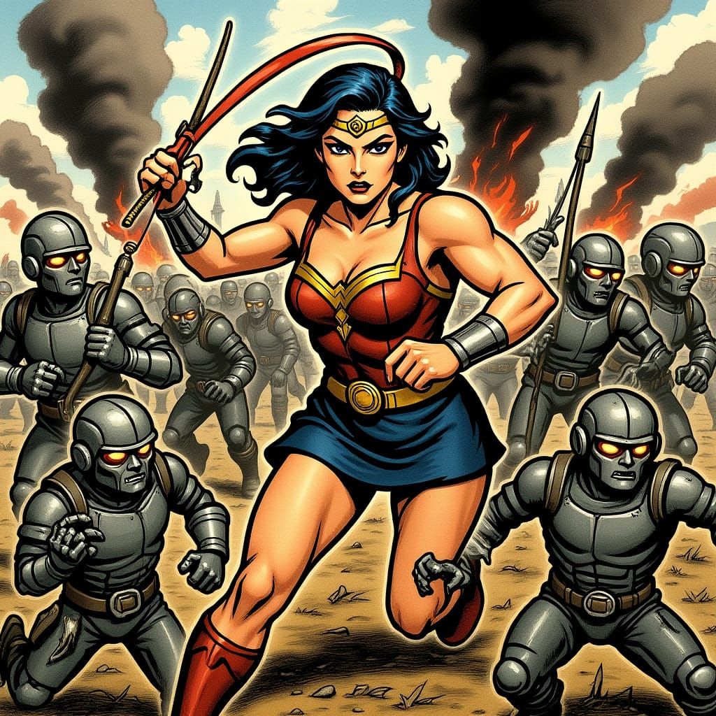 envision a diecast steampunk Wonder Woman battling a horde of futuristic robots on the battlefields of World War I. She wields her lasso of truth and defends the trenches with unmatched bravery. Rendered in the style of classic comic book art, with bold lines, bright colors, and dynamic action poses, ...