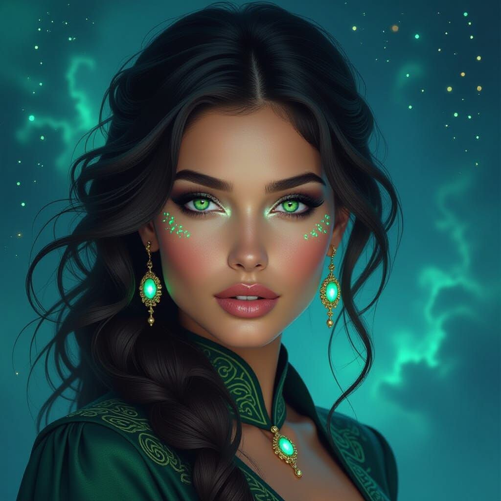 A mesmerizing portrait of a woman with piercing green eyes and glowing tattoos. The artwork blends dark surrealism and art nouveau elements to create an ethereal, otherworldly aesthetic.