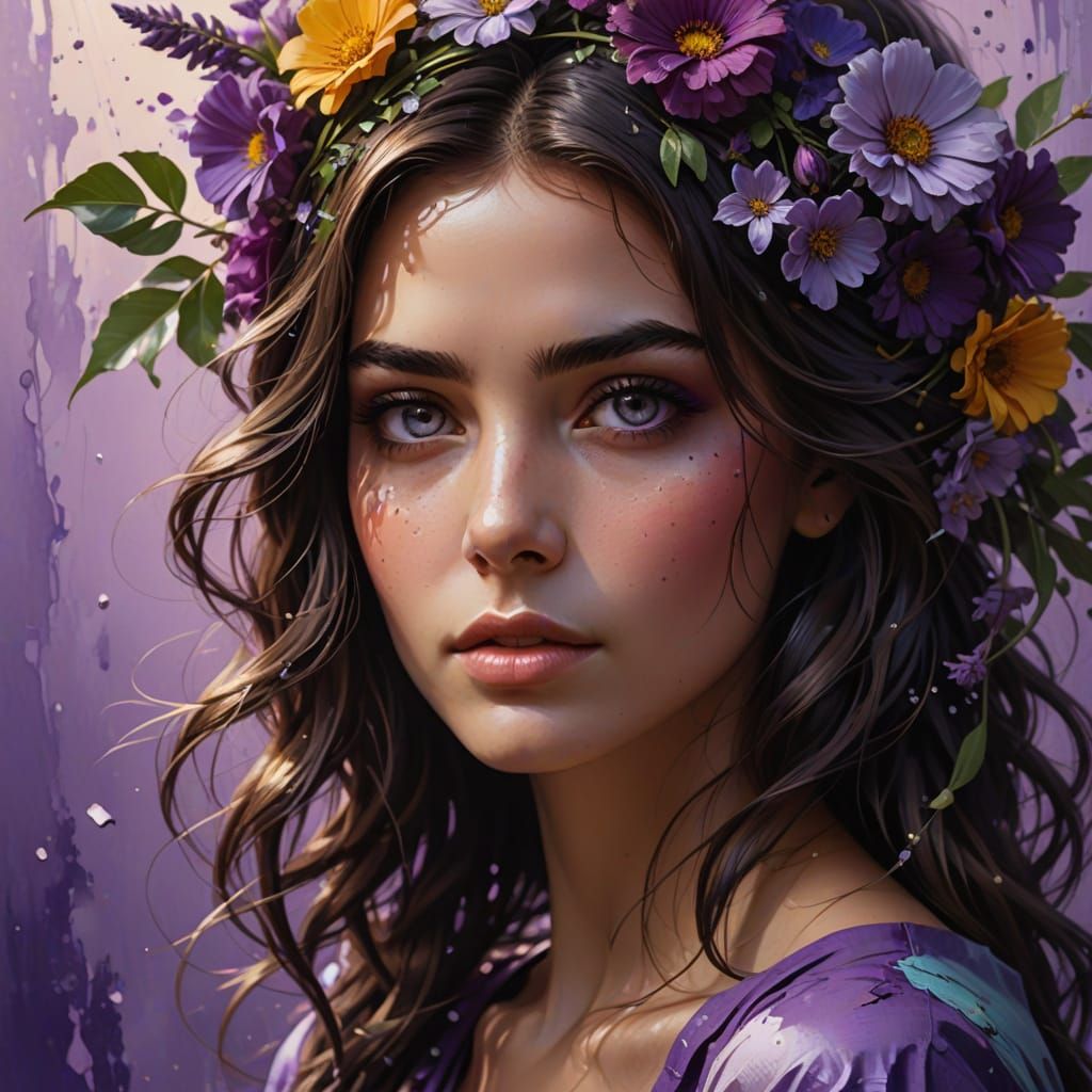 This image shows a stunning brown-skinned woman with piercing violet eyes, dressed and styled elegantly, set amidst a vibrant and dreamlike landscape with intricate details and a dramatic color palette.