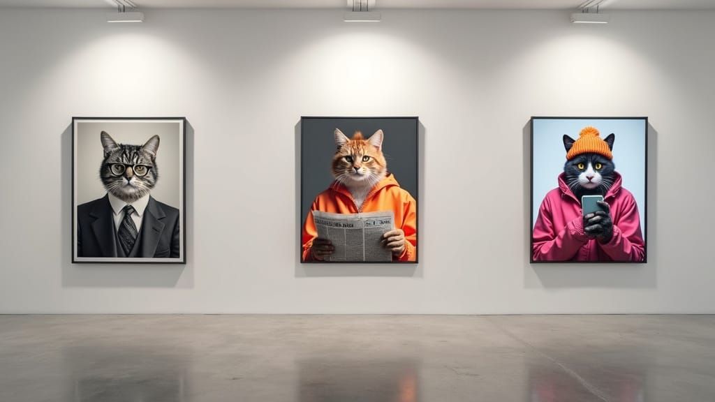 This image shows three cat portraits displayed in an art gallery, each reflecting a different generation. The portraits are presented with photographic realism and soft, ambient lighting.