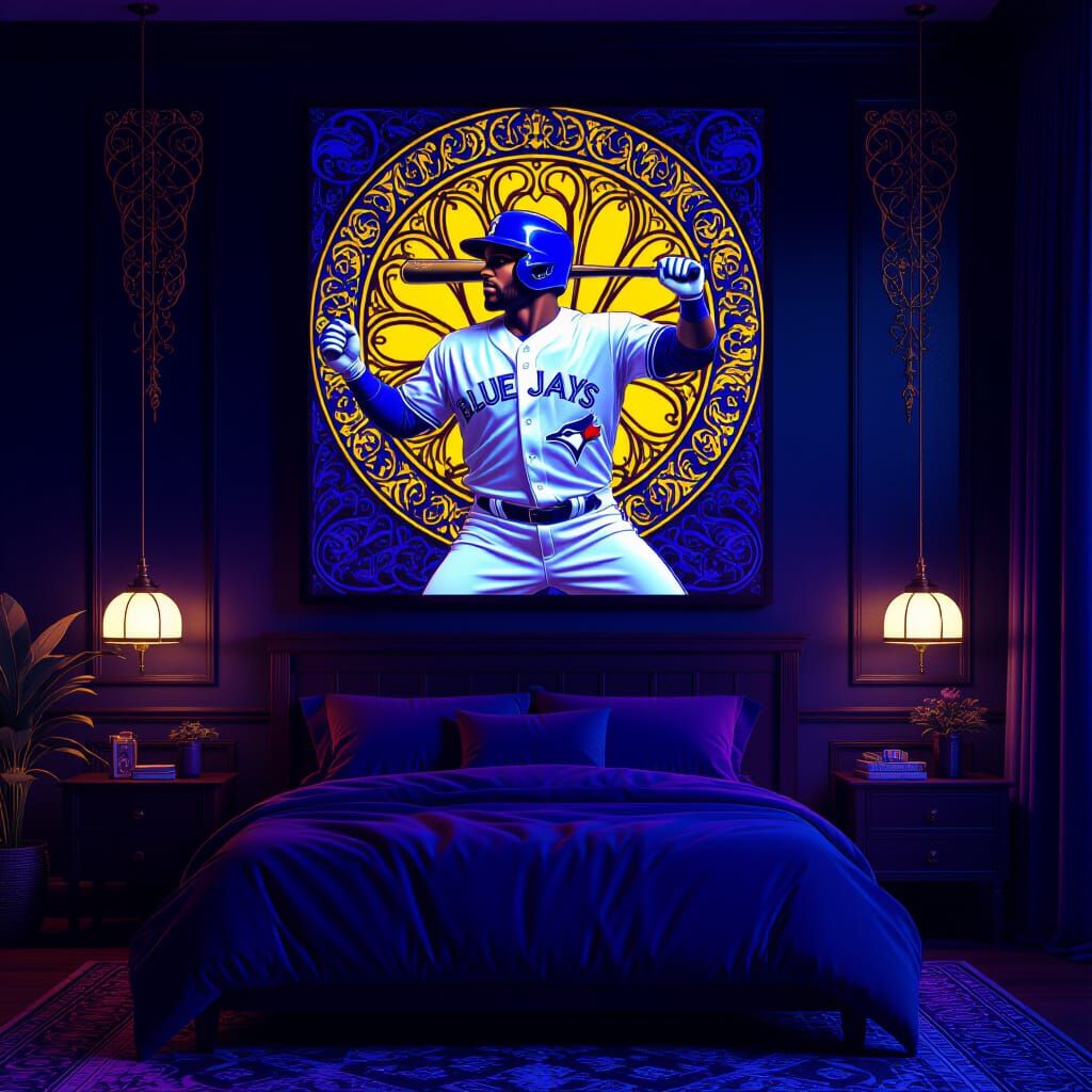 A hyperdetailed poster of the Toronto Blue Jays baseball team displayed on a dark, mystical bedroom wall, featuring dynamic lighting and ornate details in deep purple and yellow hues.