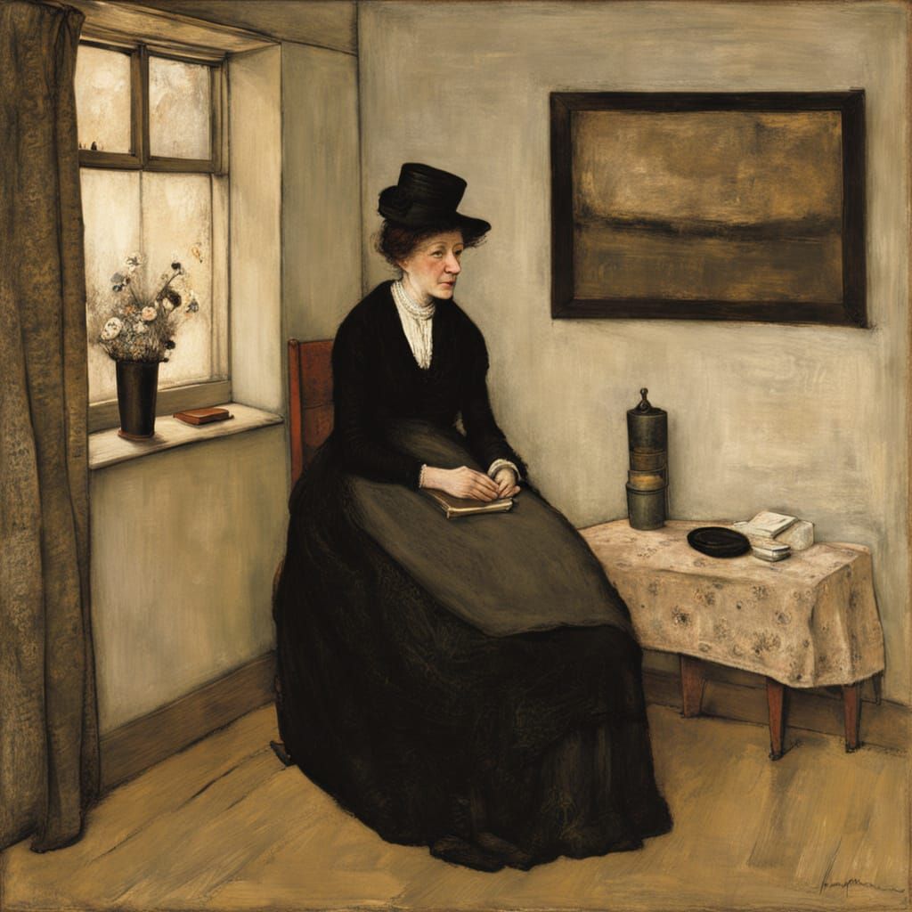 This image shows a velvet painting in a muted post-impressionistic style. It depicts a sleepless poet in a tiny garret room, reminiscent of James Whistler's Mother.