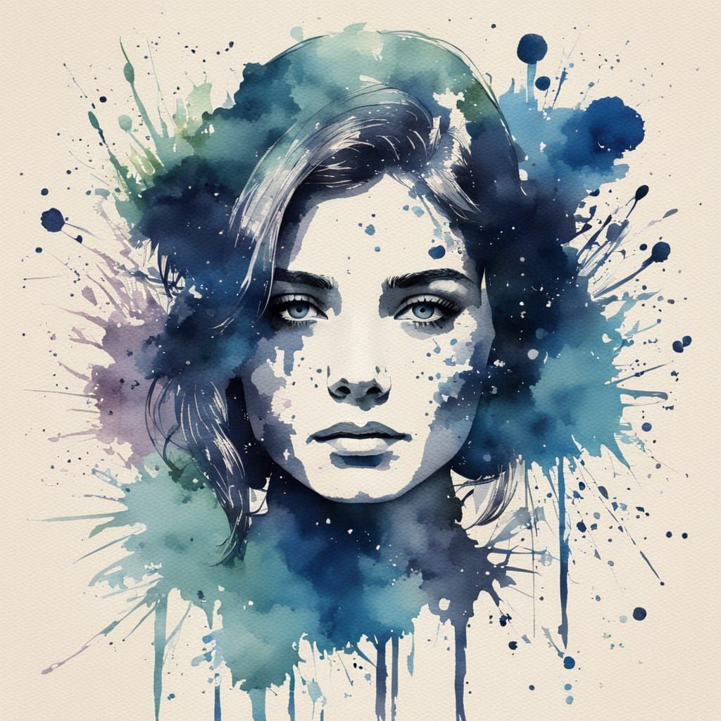This image shows a vintage-style portrait effect created with watercolor and ink splatters, giving it a unique and artistic aesthetic.