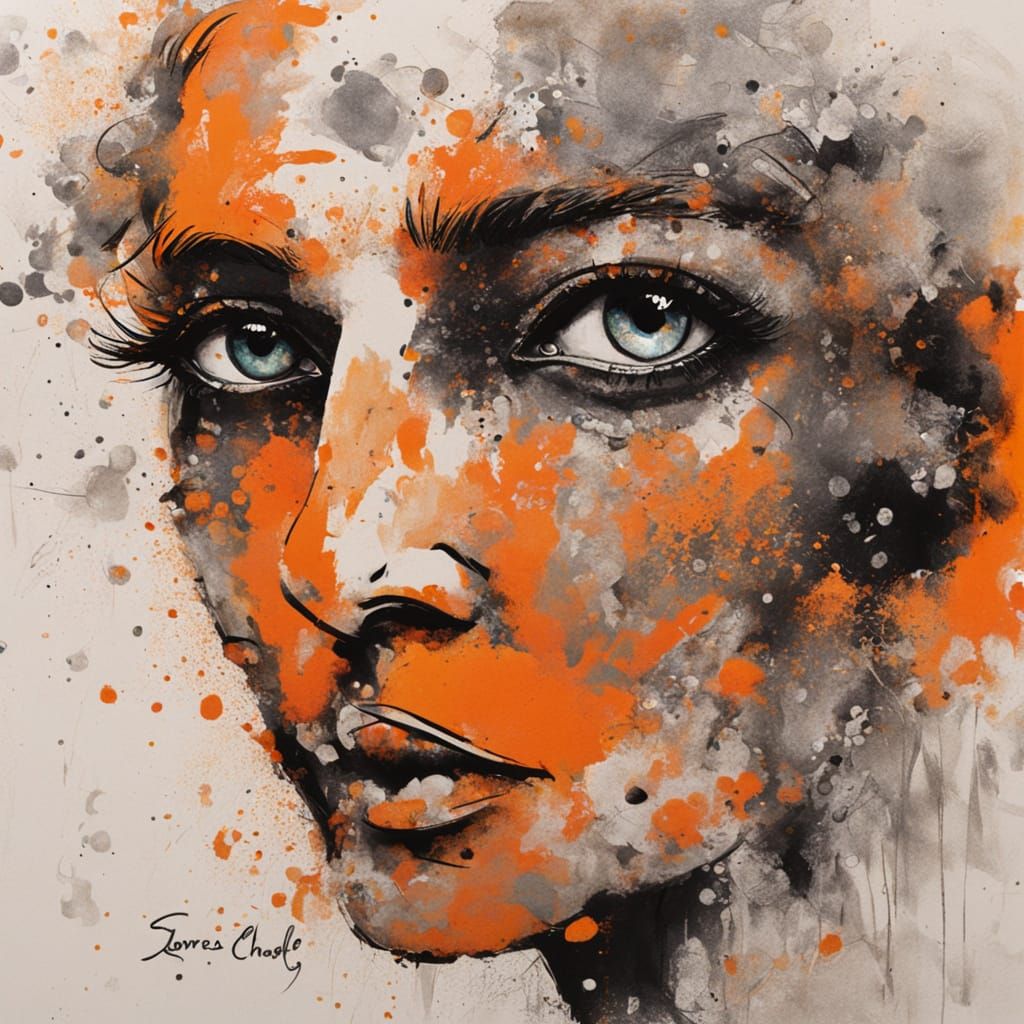 A surreal portrait with a focus on eyes, rendered with a distinctive orange color palette and grunge textures. The artwork evokes a whimsical, slightly distressed aesthetic.