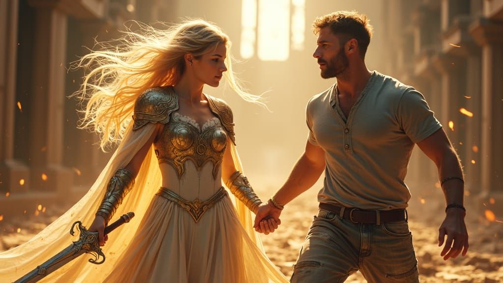 This image depicts a celestial warrior and her rugged ally standing back to back, ready to face battle together. The warrior's resplendent robes shimmer with golden light, while her ally wears practical attire. The scene is set in a ruined church courtyard at dusk.