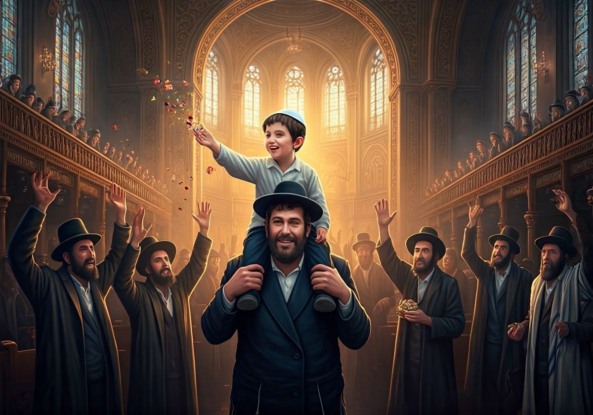 This image shows a boy in traditional Jewish clothing joyfully throwing candy from his father's shoulders in a 19th-century synagogue. Worshippers reach out to catch the candy in the warm, detailed scene reminiscent of Thomas Kinkade.