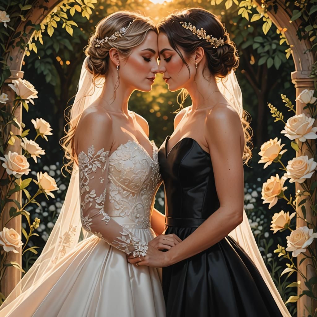 This image depicts a lesbian couple on their wedding day, sharing a kiss during the golden hour. One bride wears a white dress, the other a black dress.