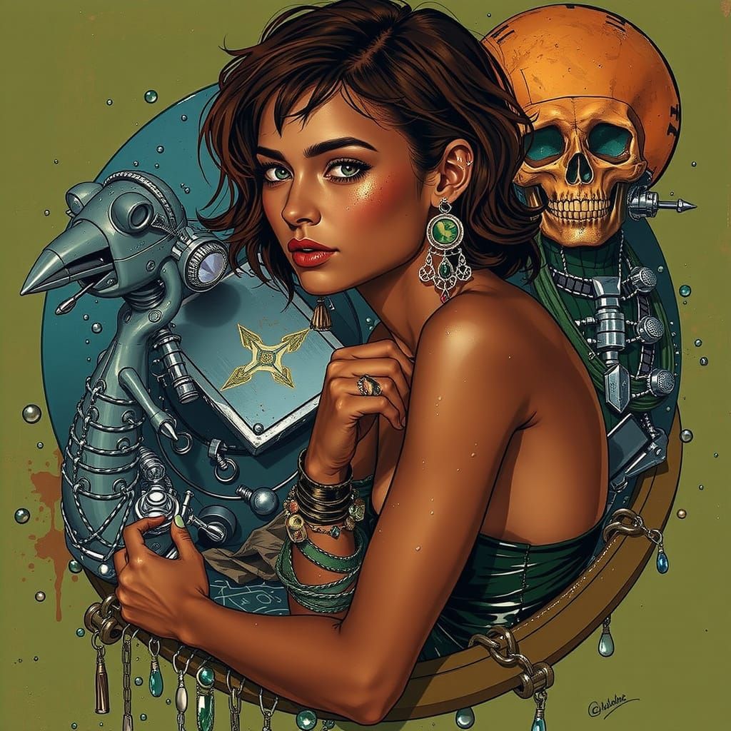 This image depicts a scene characterized by glamour, furtiveness, and ingenuity, rendered in shades of wet green.