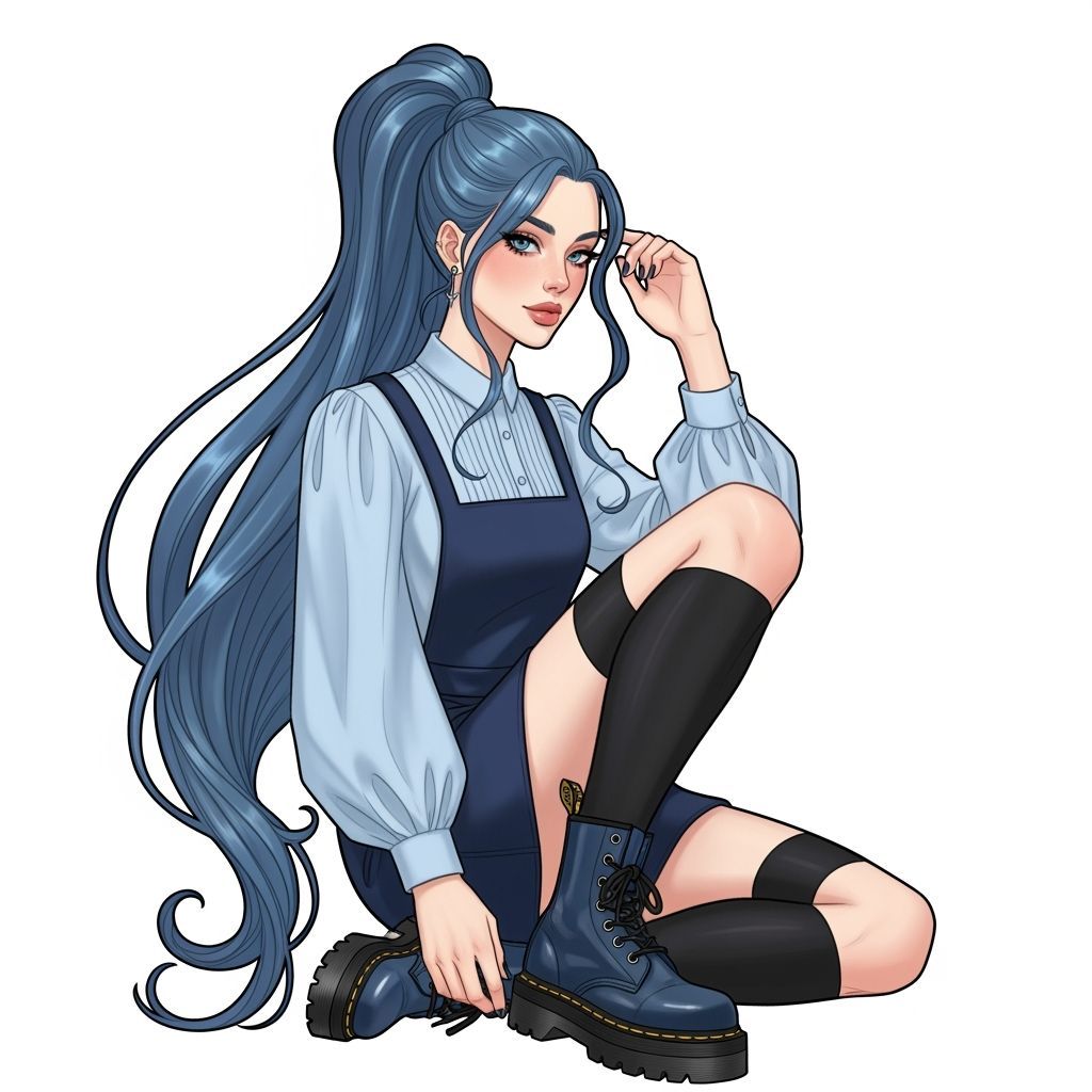 This digital painting features a confident woman with blue hair in a ponytail, wearing a blouse, jumper dress, and Doc Martens. Inspired by Mucha and Hayden Williams, it has soft, romantic lighting.