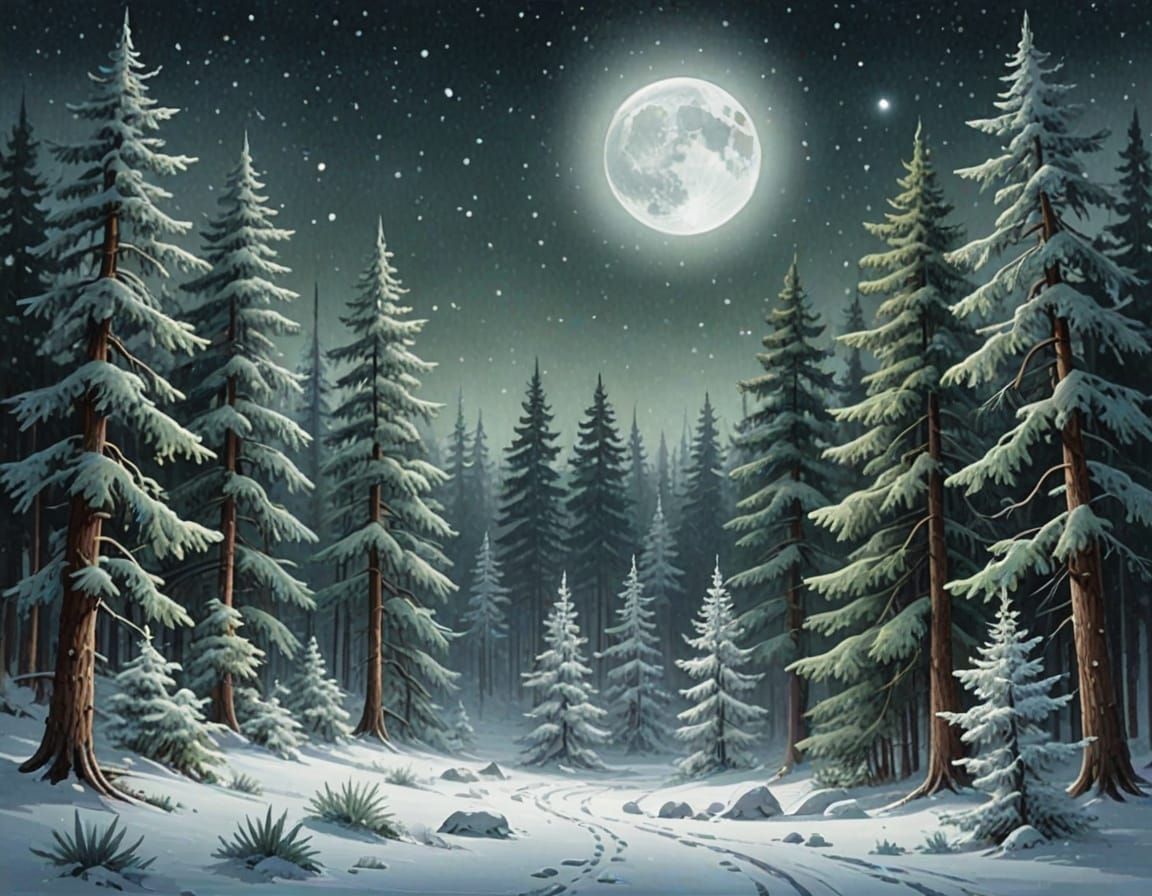 A tranquil scene of a snow-covered pine forest under a full moon. The digital painting features cool silver highlights, creating crisp contrasts and a dreamlike, ethereal mood. The artwork uses soft gradients.