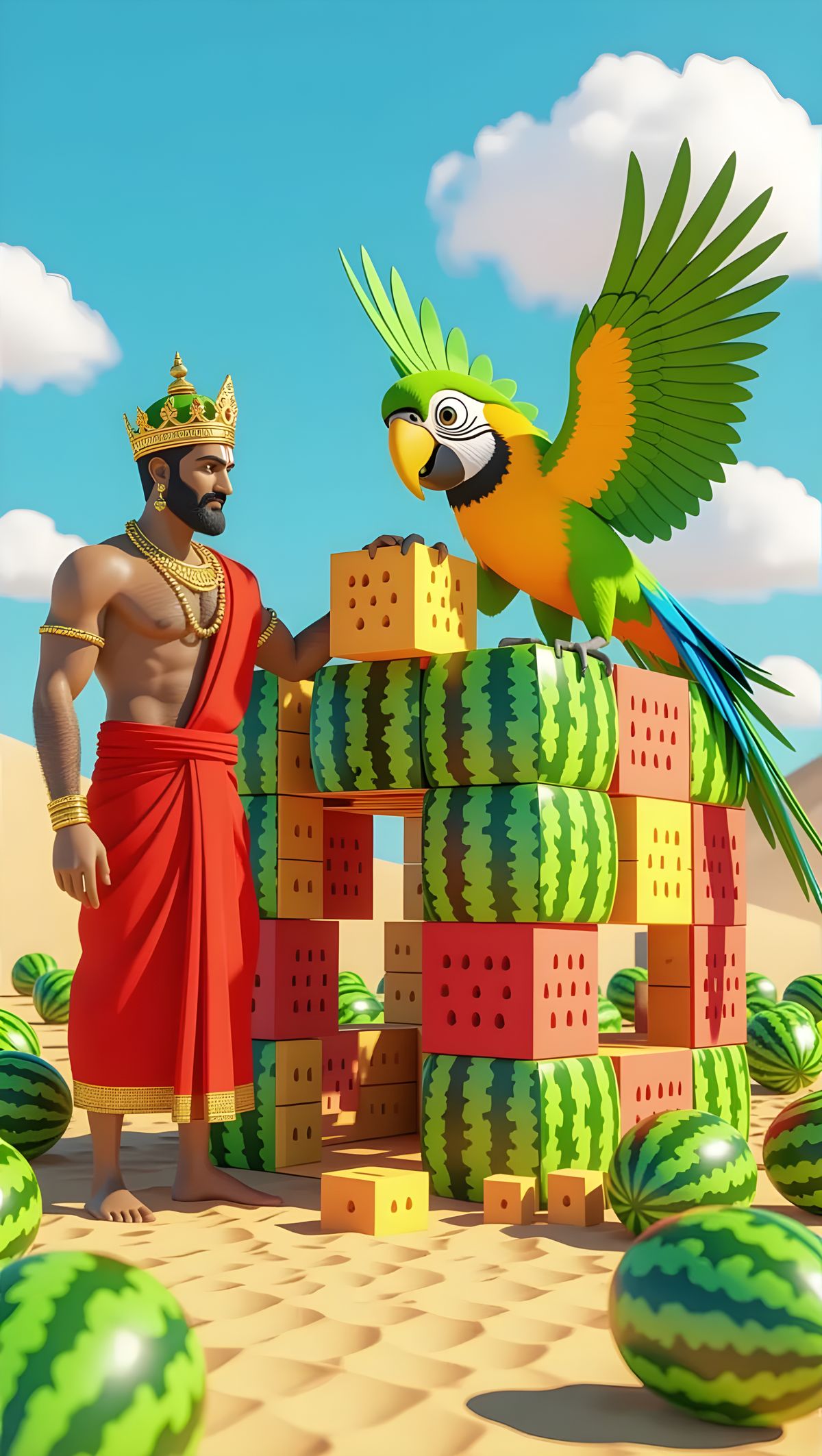 This vibrant 3D scene captures a whimsical moment in a sunny desert town, where a regal Indian king and his loyal parrot companion work together to build a unique house made from giant watermelons. With cinematic lighting and highly detailed textures, the scene exudes a sense of humor and emotional story...