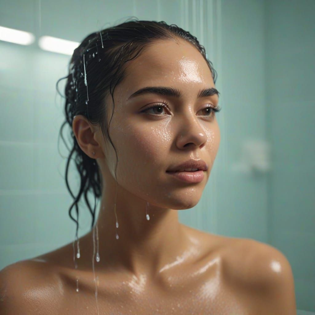 This image shows a mixed-race woman in a shower, gently washing her hair. The portrait photography emphasizes soft focus and pastel colors, creating a relaxing and calming atmosphere in the steamy bathroom.