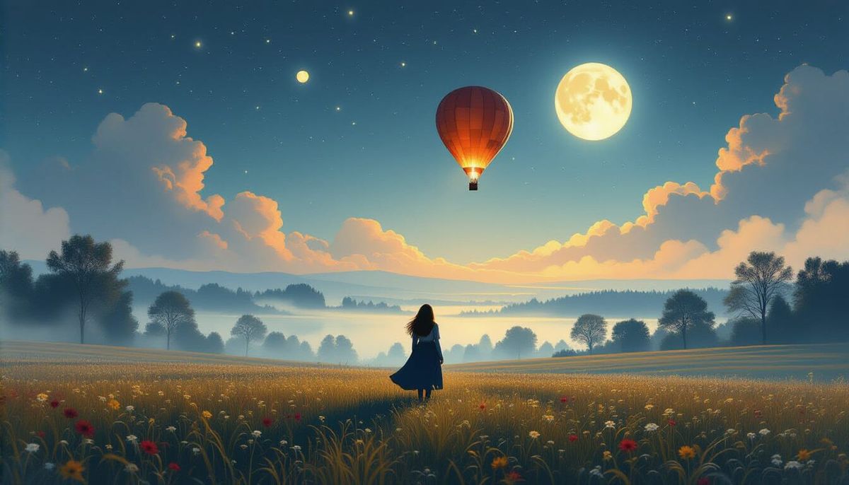 A captivating image of a girl in a misty field watching a departing hot air balloon. Rendered with crisp quality and cool, dark colors in a surreal, painterly style with a moody, ominous atmosphere.