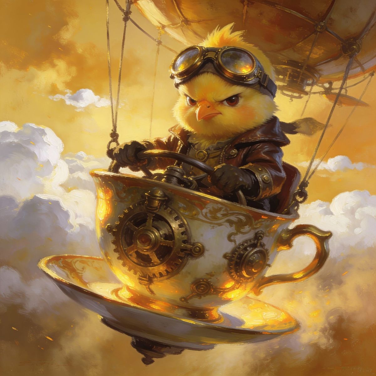 This image shows a grumpy chick in aviator gear piloting a teacup airship amidst fluffy clouds in a warm, hazy sky. Features a detailed steampunk oil painting style with dramatic lighting and a warm color palette.