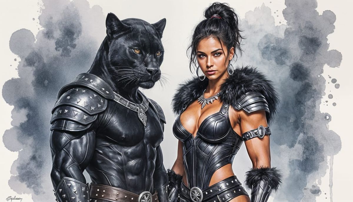 A striking picture of an amazonian woman and a black panther. The woman has short black hair, a muscular build, and wears studded leather armor with fur trim, depicted in a smokey black ink blot watercolor style.
