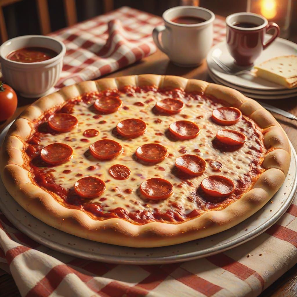 This image shows a pepperoni pizza in a retro diner setting. The picture features warm colors and soft focus, creating a nostalgic and inviting ambiance in an oil painting style.