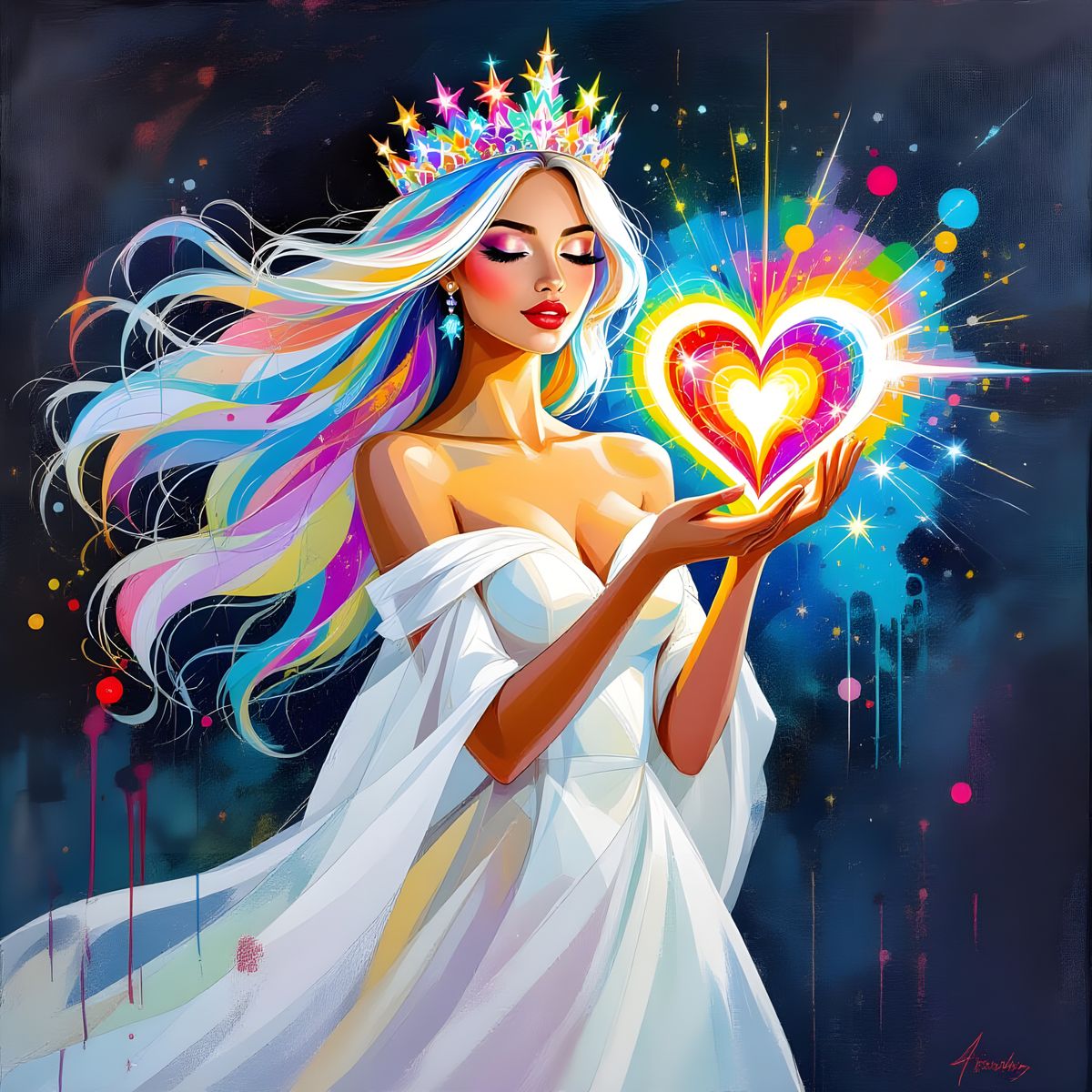 A digital painting of a woman with colorful flowing hair and a crown of stars, holding a radiant heart. This artwork is in an abstract expressionist and pop art style.