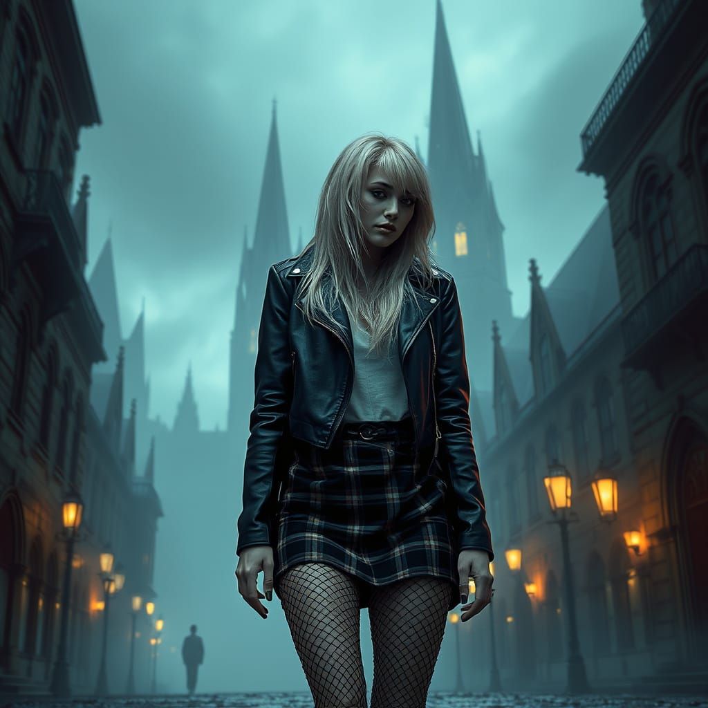 A photorealistic image of an albino woman in a leather jacket and plaid skirt exploring a dark, misty cityscape. Gothic spires and flickering lamps create an atmospheric scene.