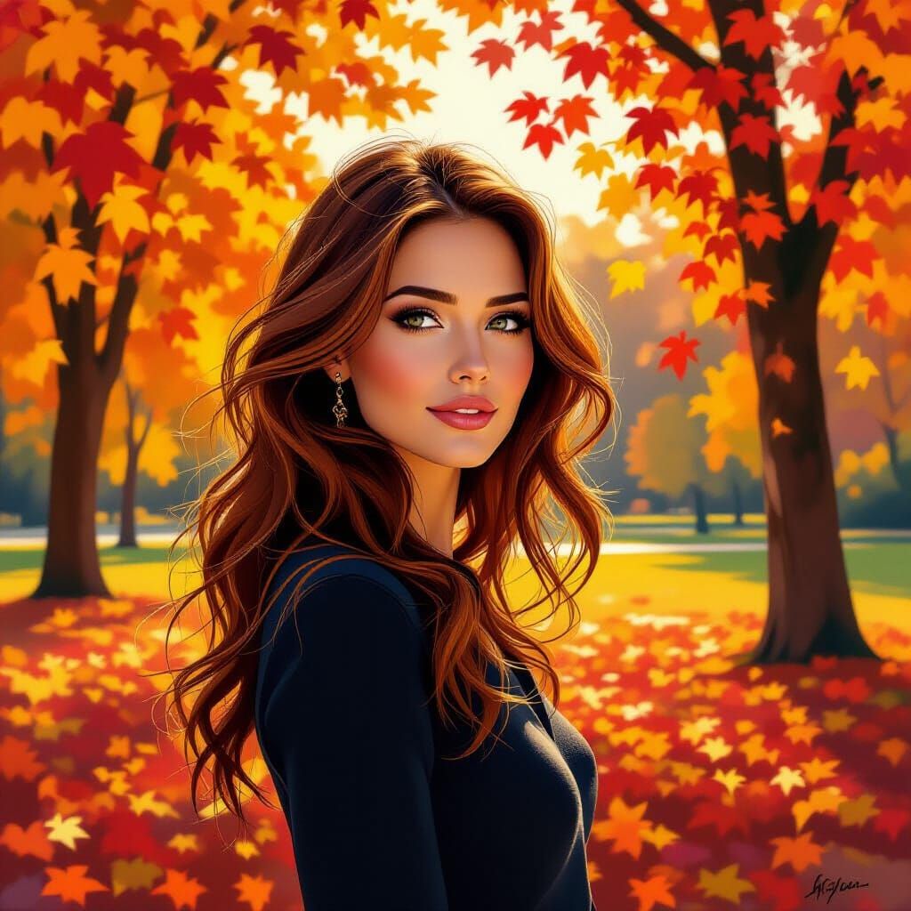 This impressionistic oil painting captures a woman with auburn hair in a park during golden hour. The background features a stunning display of red and orange autumn leaves, creating a warm, enchanting scene.