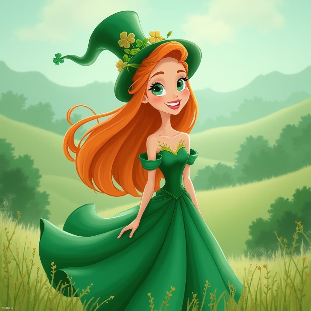 A charming watercolor-inspired painting of a smiling Saint Patrick's Goddess with sparkling eyes, set against a soft Irish landscape with rolling hills and misty valleys, blending classic Disney animation styles.