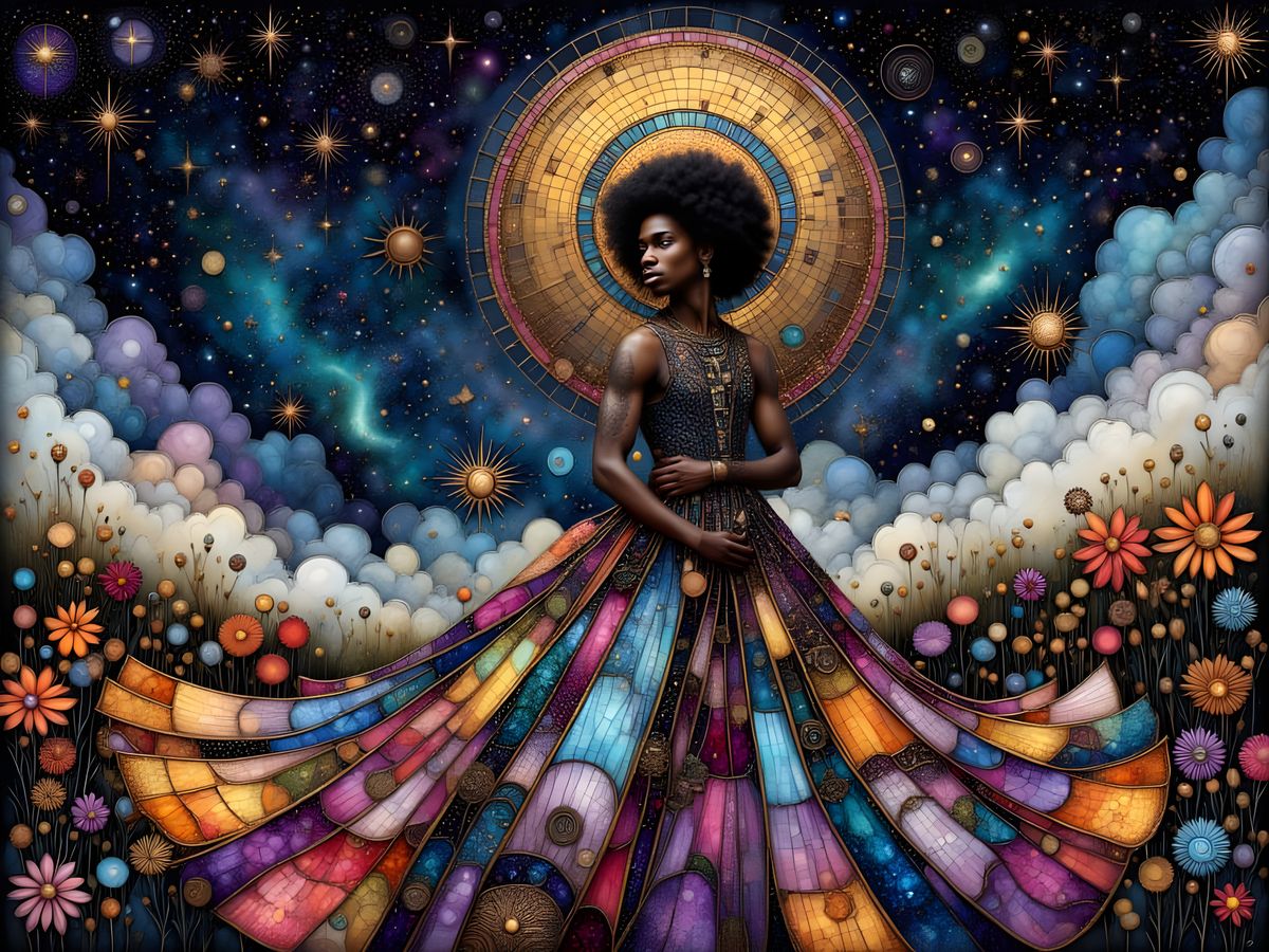 This image shows a goth punk African man in a voluminous gown against a cosmic backdrop. Features rainbow colors, lace texture, and geometric zentangle patterns.