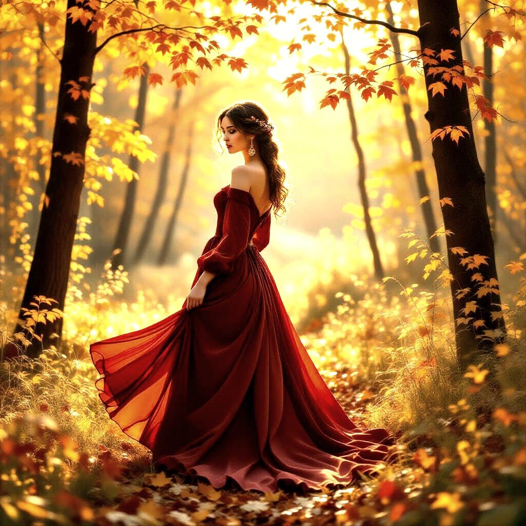 A beautiful woman in a flowing crimson and russet dress stands in a sunlit forest. Golden light illuminates falling leaves, creating an ethereal glow in a painterly style.