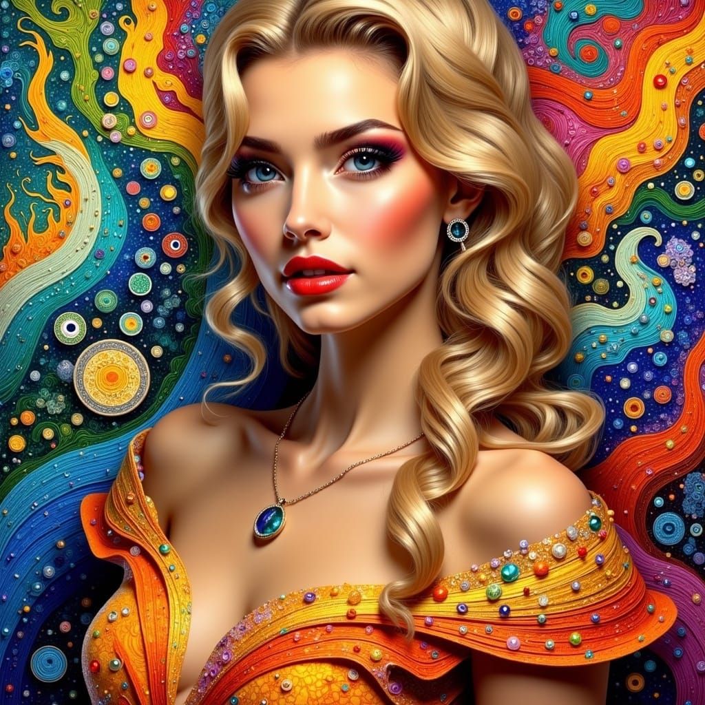 A striking picture of a beautiful woman in a shimmering gown, set against a swirling, colorful background. The artwork blends Klimt-like brushstrokes with playful Matisse patterns and a superflat aesthetic.