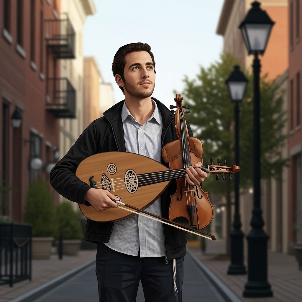 This image shows a young Jewish man holding a violin on a sunlit street. The scene is realistic, capturing a moment of quiet determination in everyday life. The background is softly focused to keep the attention on the man.