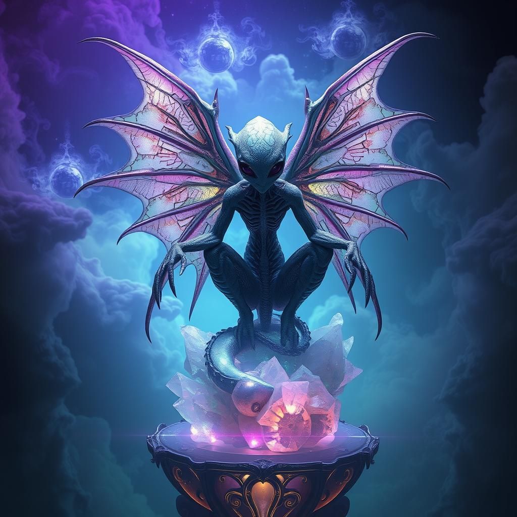 A striking picture of an alien entity with iridescent skin and translucent wings, seated on a crystalline pedestal amidst swirling purple and green gases. The image features intricate textures and dynamic lighting in a dark, mystical style.
