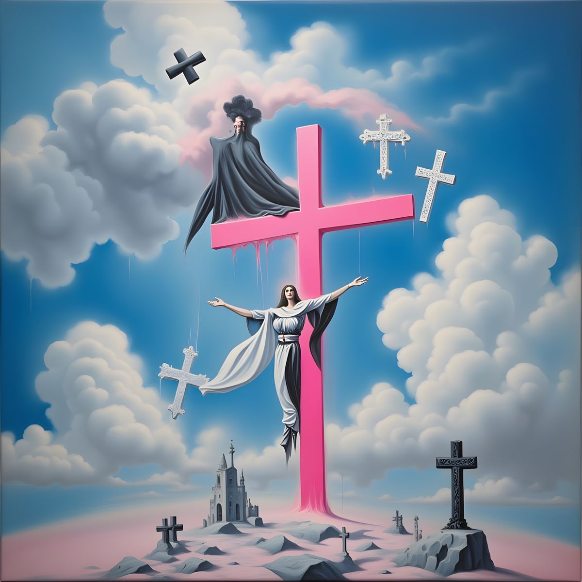 This image depicts a nun soaring through the sky on a pink cross. The artwork presents a surreal and visually striking composition.