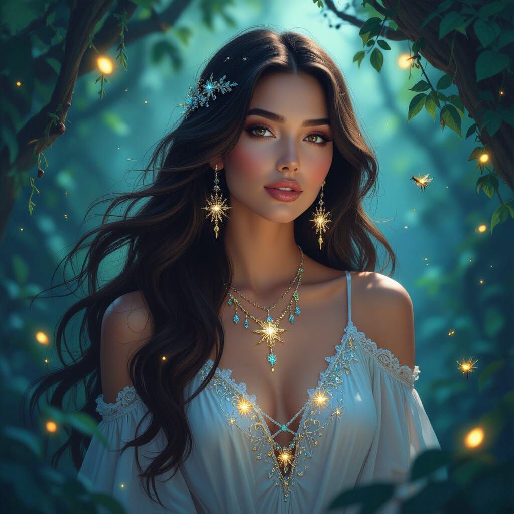 A captivating image of a woman in a bioluminescent grove. The scene blends hyper-realism and art nouveau elements to create an ethereal atmosphere, with vibrant colors and dynamic lighting.
