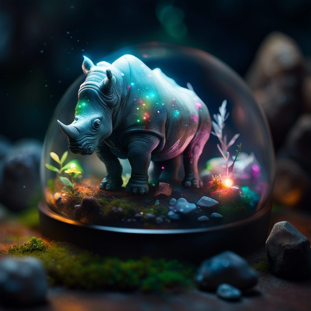 A tilt-shift illustration of a miniature ghost rhino inside a terrarium. Colorful, sparkling mineral rocks surround the creature in this highly detailed digital artwork.