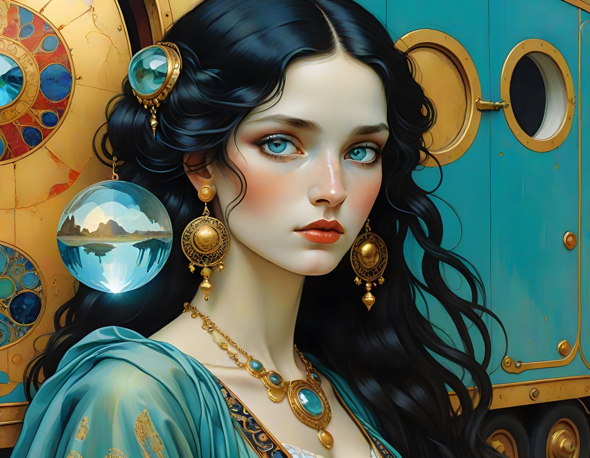 A striking picture of a beautiful gypsy woman with long black hair and large earrings, holding a crystal ball. The artwork is reminiscent of pre-Raphaelite paintings, with gold foil details and vibrant colors.