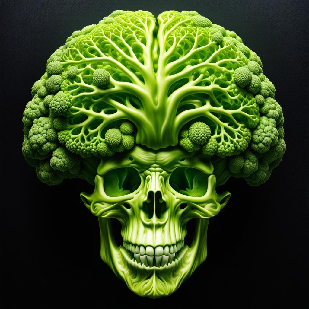 A striking picture of a brain formed from Romanesco cabbage, set against a black backdrop. The image features intricate textures, detailed color shading, and a mystical, hyperdetailed aesthetic reminiscent of body horror art.