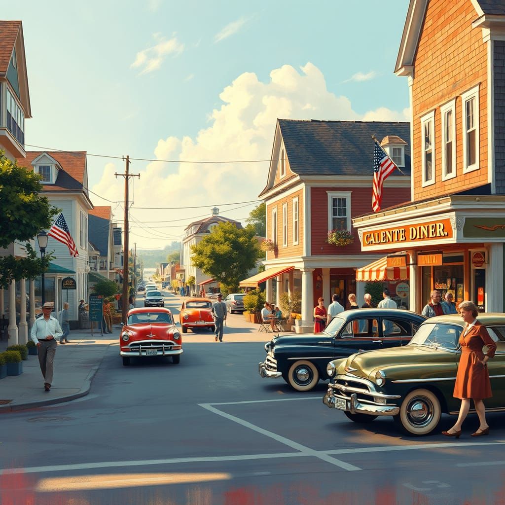 This image shows a quaint New England town square in the 1950s. The warm summer scene, reminiscent of small-town Americana, is presented with impressionistic coastal beauty. The image evokes nostalgia.