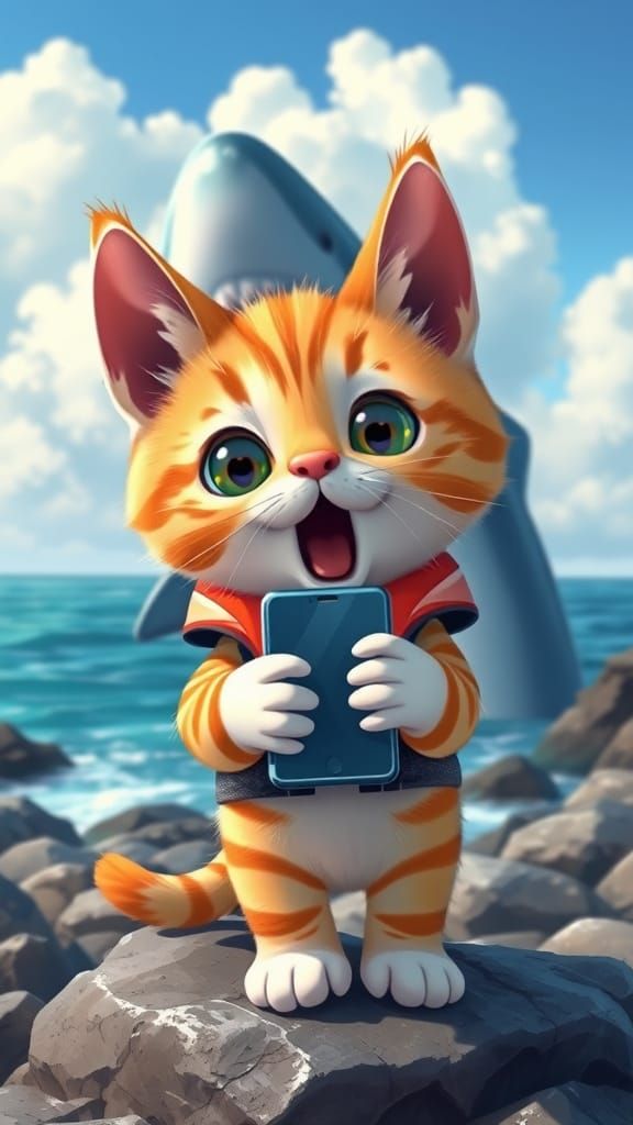 This image shows an orange tabby kitten holding a smartphone, seemingly taking a selfie. Unbeknownst to the feline, a great white shark lurks nearby in this vibrant, cartoonish digital painting.