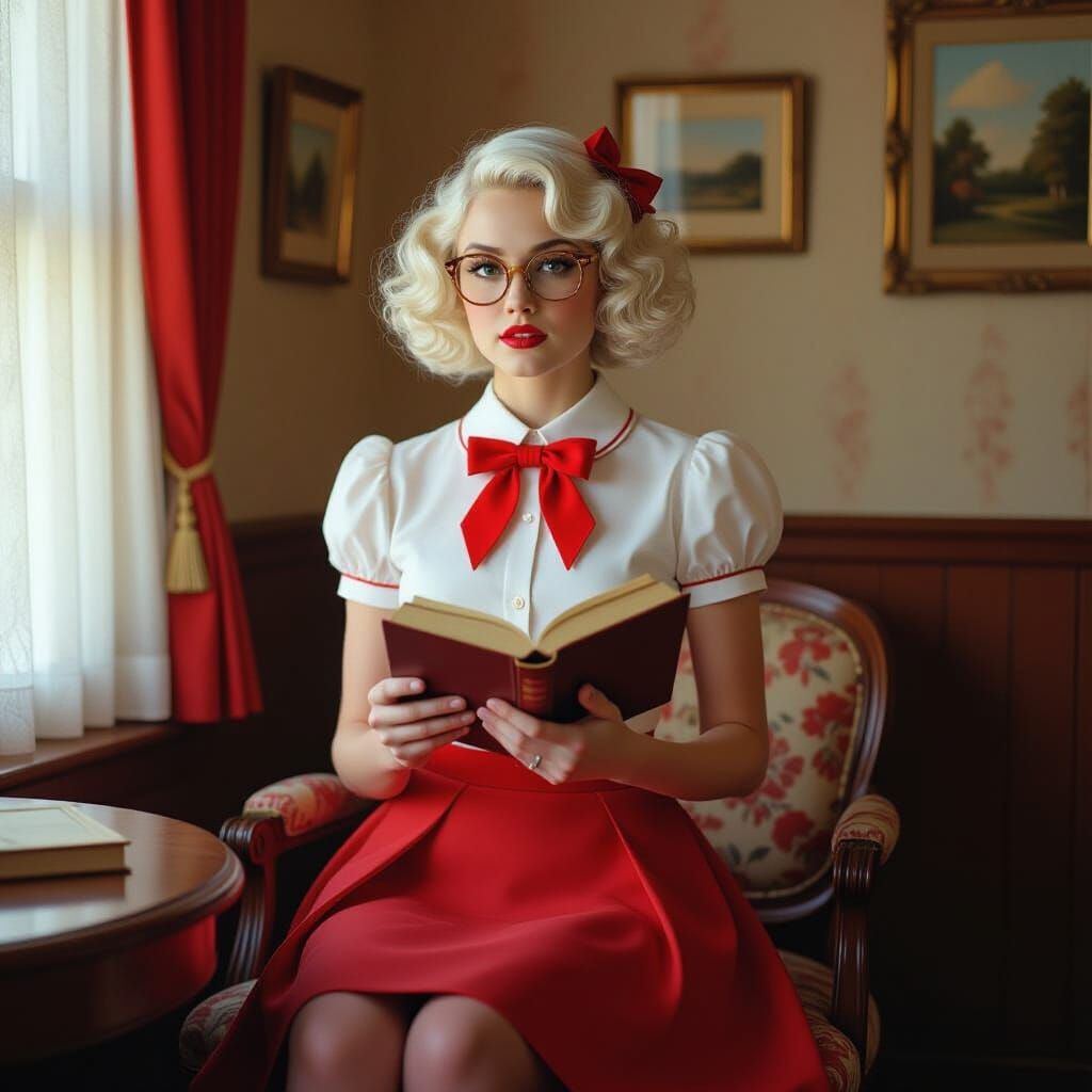 This image shows a girl with white curly hair wearing glasses and a white blouse, holding a book. The cinematic style evokes a warm, nostalgic aesthetic reminiscent of classic film, complete with film grain.