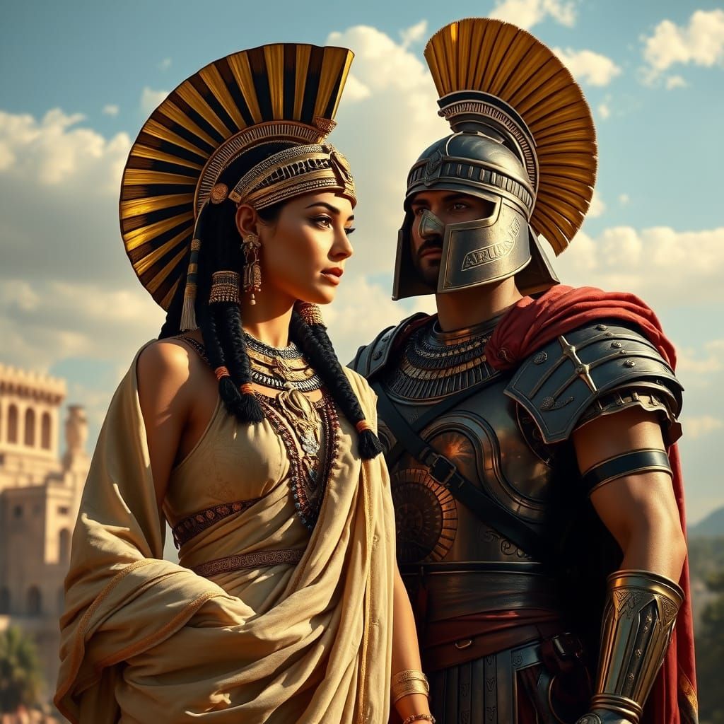 This image depicts a powerful scene of Cleopatra VII and Mark Antony standing together in a sunlit Alexandria landscape, blending Egyptian and Roman elements in a style reminiscent of 19th-century European art.
