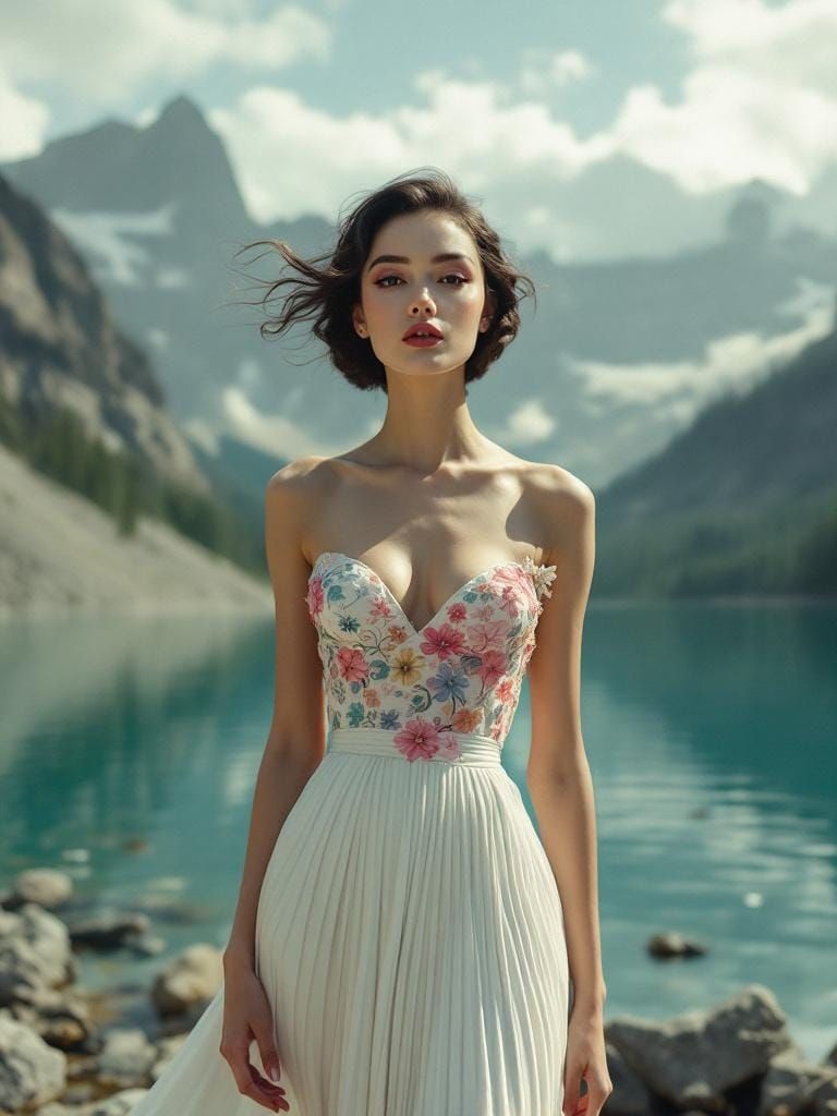 A vibrant silk embroidery of a pin-up woman at a mountain lake. The image blends dreamlike figures with Art Deco forms, using varied stitch patterns to create dimensional textures in a Marc Chagall and Tamara de Lempicka style.