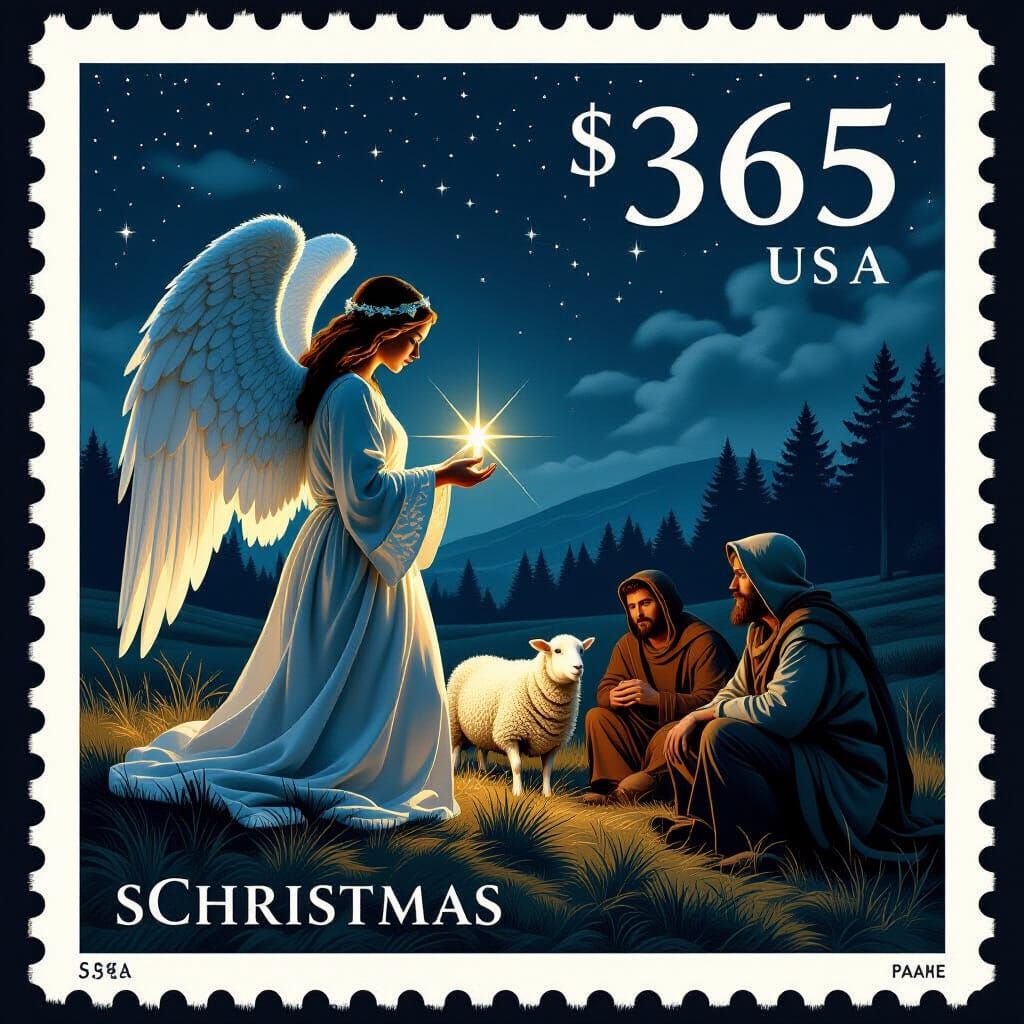 This image shows a Christmas angel and shepherds depicted on a highly detailed $365 postage stamp. The scene has a hyperrealistic and cinematic quality with high contrast HDR and atmospheric lighting.