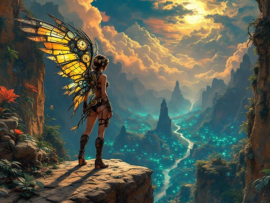 A lone woman with intricate clockwork wings, standing on a precipice overlooking a vast, prehistoric jungle teeming with bioluminescent flora