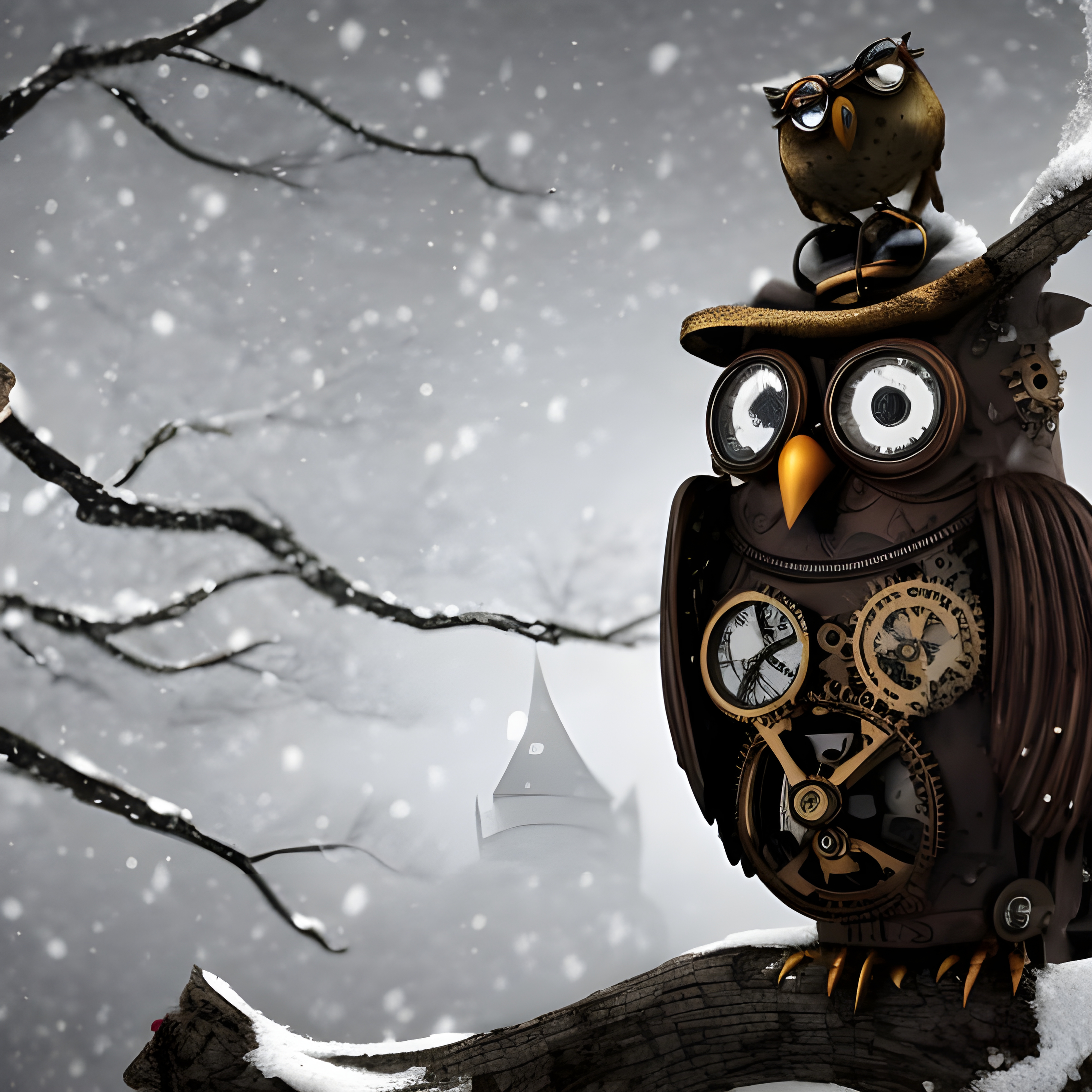 A detailed image shows a steampunk mechanical owl perched on a branch. A snowy landscape stretches out, with a medieval castle visible in the distance, rendered in a realistic style.