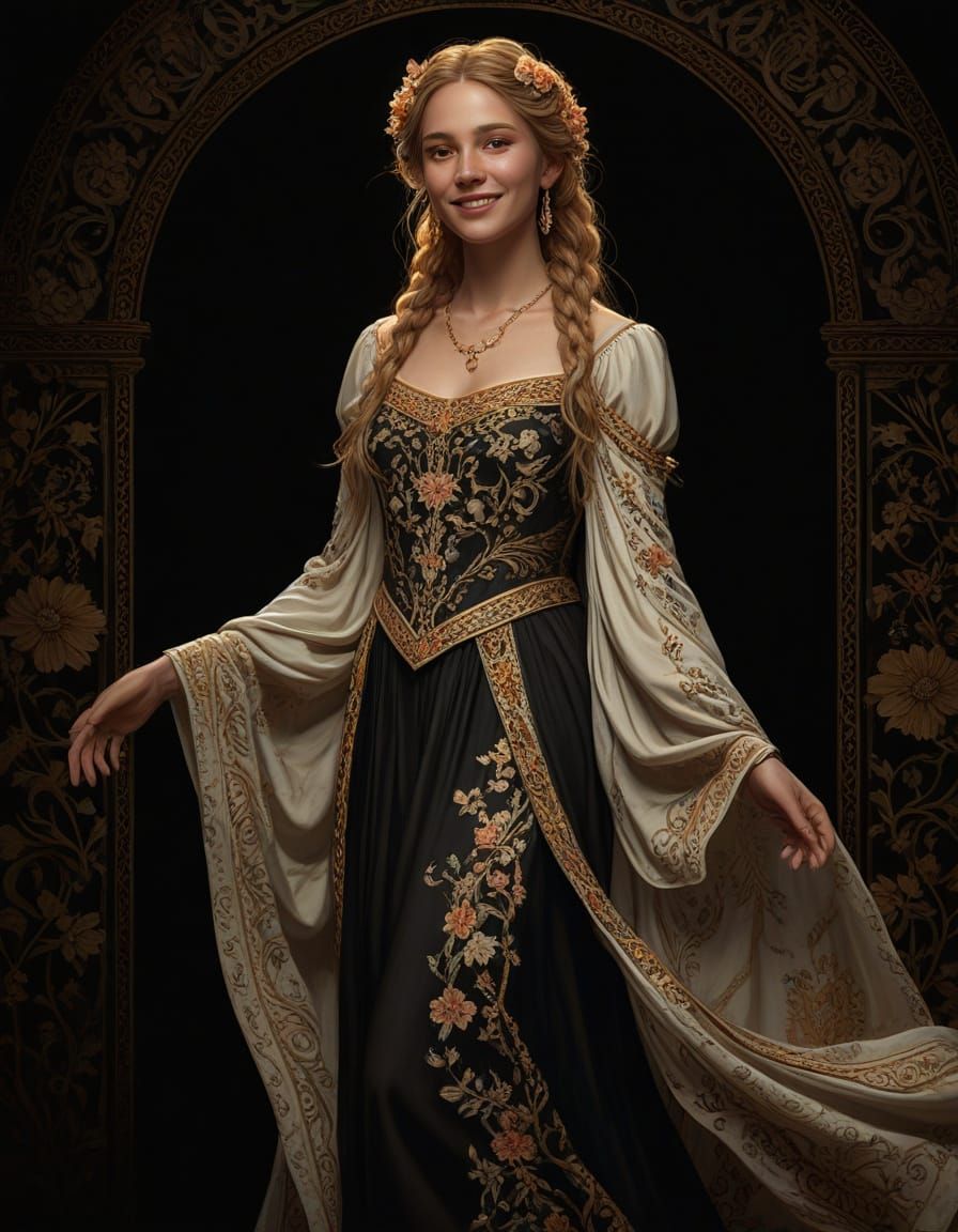 This digital painting showcases a medieval Spanish woman with flowing hair, smiling against a black background. The artwork features intricate details and dramatic lighting in the style of Art Nouveau.