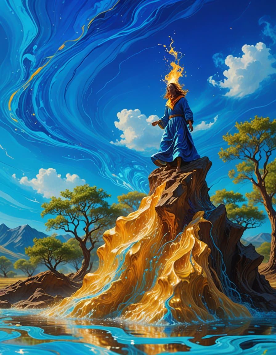 This image shows a person channeling energy in an earthy, mystical setting. The vibrant oil painting features swirling water patterns and glowing blue lines in a surreal, dreamlike 3D animation.