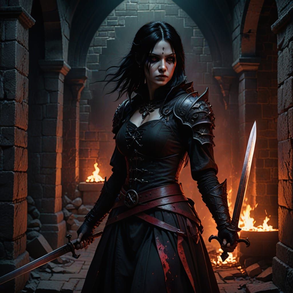 This image shows a dark fantasy portrait of a black-haired woman with striking red eyes gripping a sword. The scene is set in a gothic demon lair, with dramatic shadows and intense colors creating an eerie, mystical atmosphere.