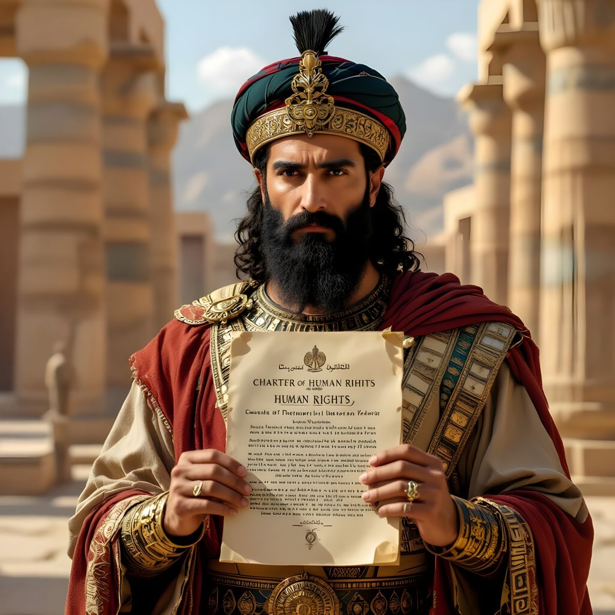 This image depicts Cyrus the Great in Persian royal attire holding the Charter of Human Rights, with Persepolis in the background. The artwork evokes dramatic baroque lighting.