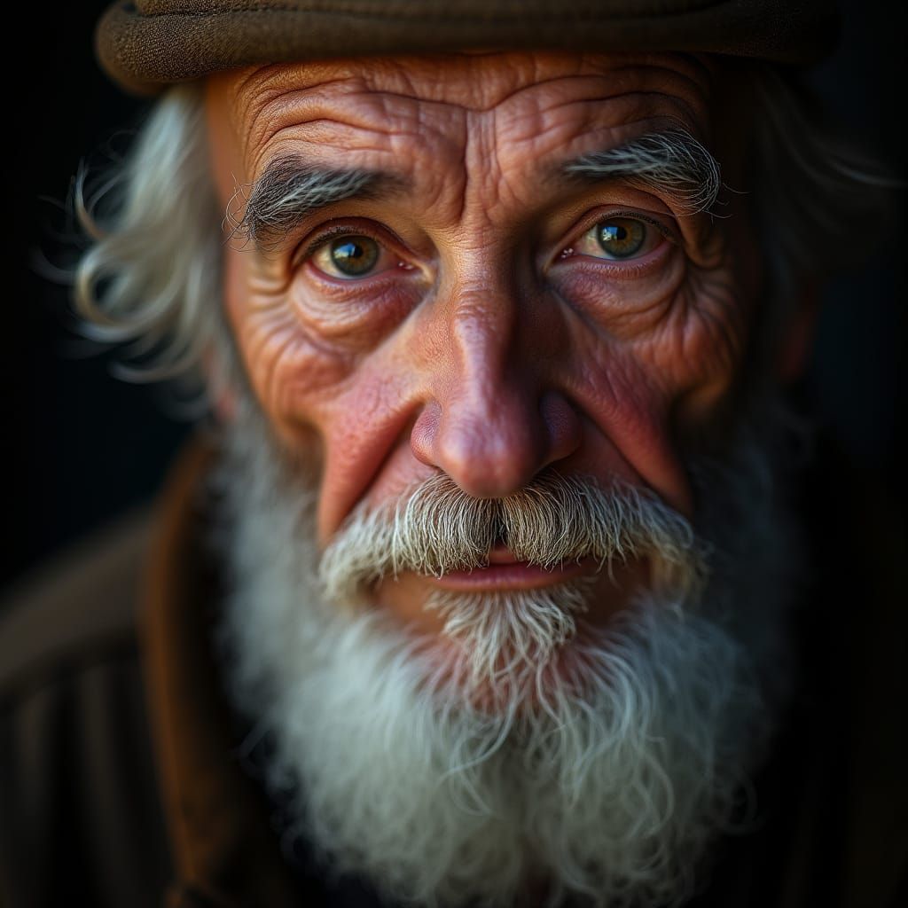 This image shows a close-up studio portrait of an elderly apothecary. The shallow depth of field highlights his wise face with intricate detail and sharp focus, in a style reminiscent of intimate portraiture.