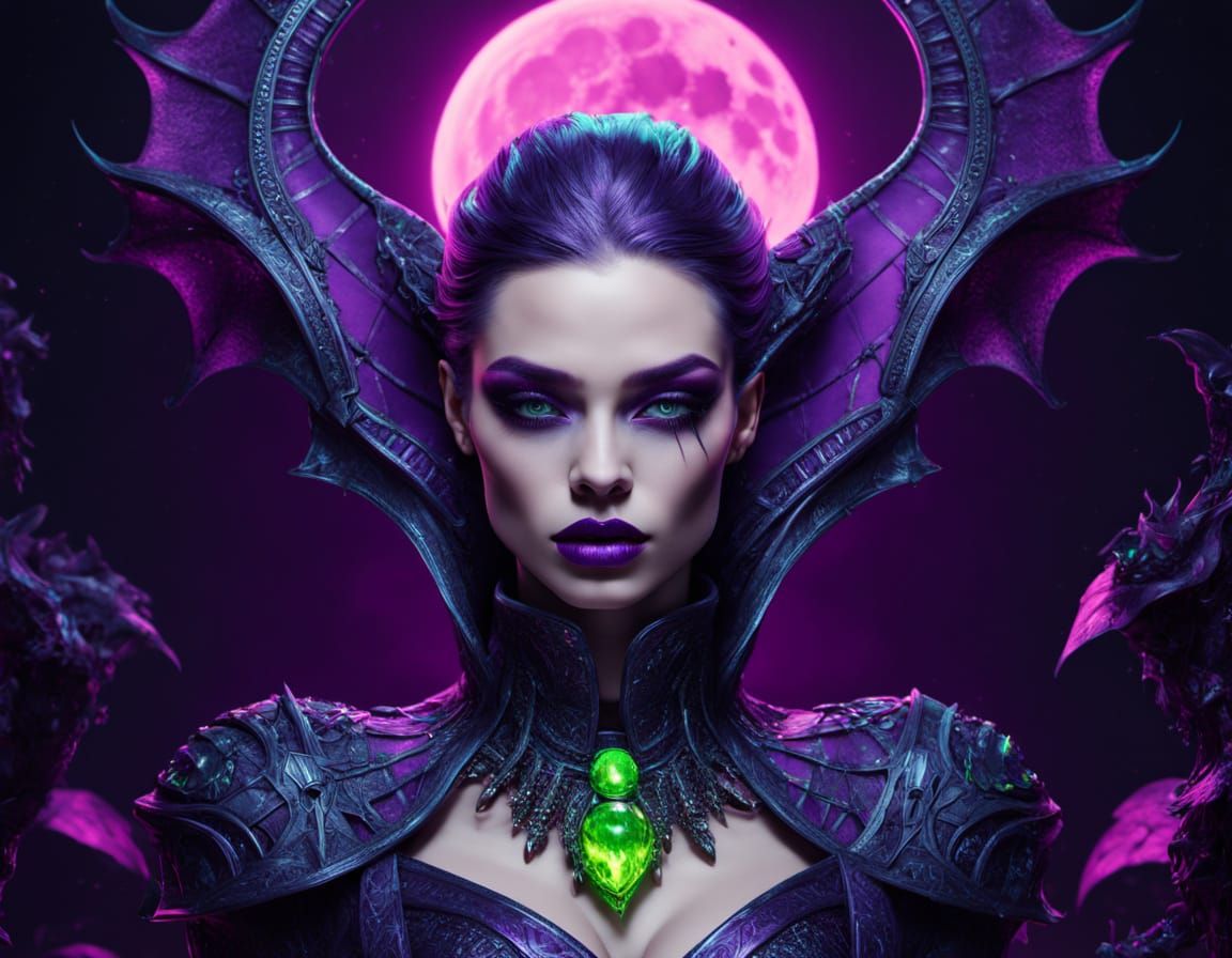 This image showcases a modern female vampire with fangs, adorned in vibrant, intricately detailed clothing and futuristic jewelry, set against a dreamy moonlit backdrop with a soft, blue-purple color scheme and neon accents.