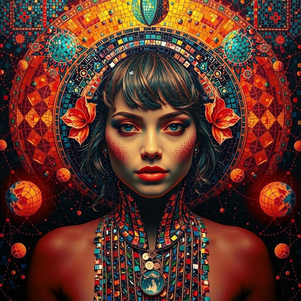 This image shows a photorealistic woman depicted in a vibrant mosaic. Iridescent colors ripple across her skin, set against a maximalist backdrop of a starry night sky. The mosaic is highly detailed.